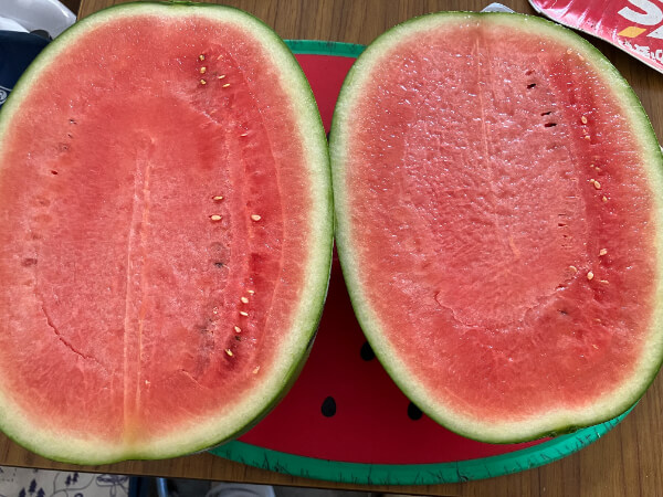 スイカの食味(旨味)に少しムラを感じました。中心は食味も濃かったのですが、皮側にいくにつれて、少し食味が薄れていく印象を受けました。とはいえ、皮際まで甘かったので美味しく食べることができました。